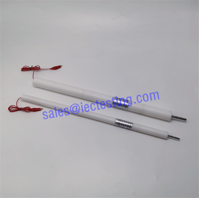 The probe is equipped with a connection cable, for verifying whether the LIVE PARTS touched, recommended to work with our anti-shock probe experiment device or a 40~50V voltage indicator. Connect the connection cable of the probe with one terminal of the anti-shock probe experiment device, and then use an additional cable to wire the LIVE PART of specimen with the other terminal of the anti-shock probe experiment device. Showing as following reference picture: